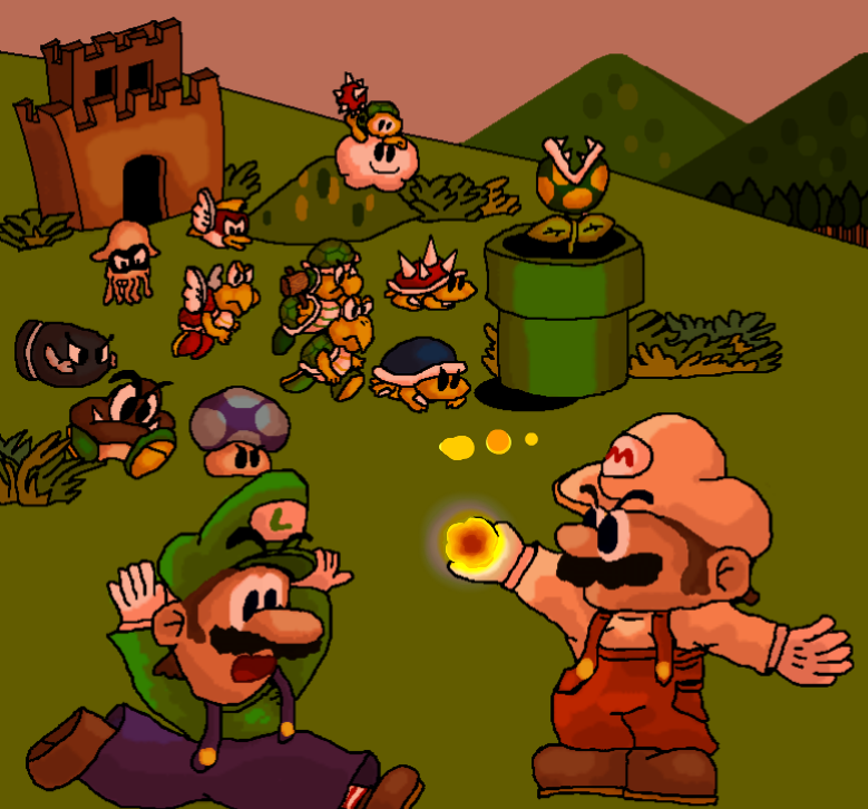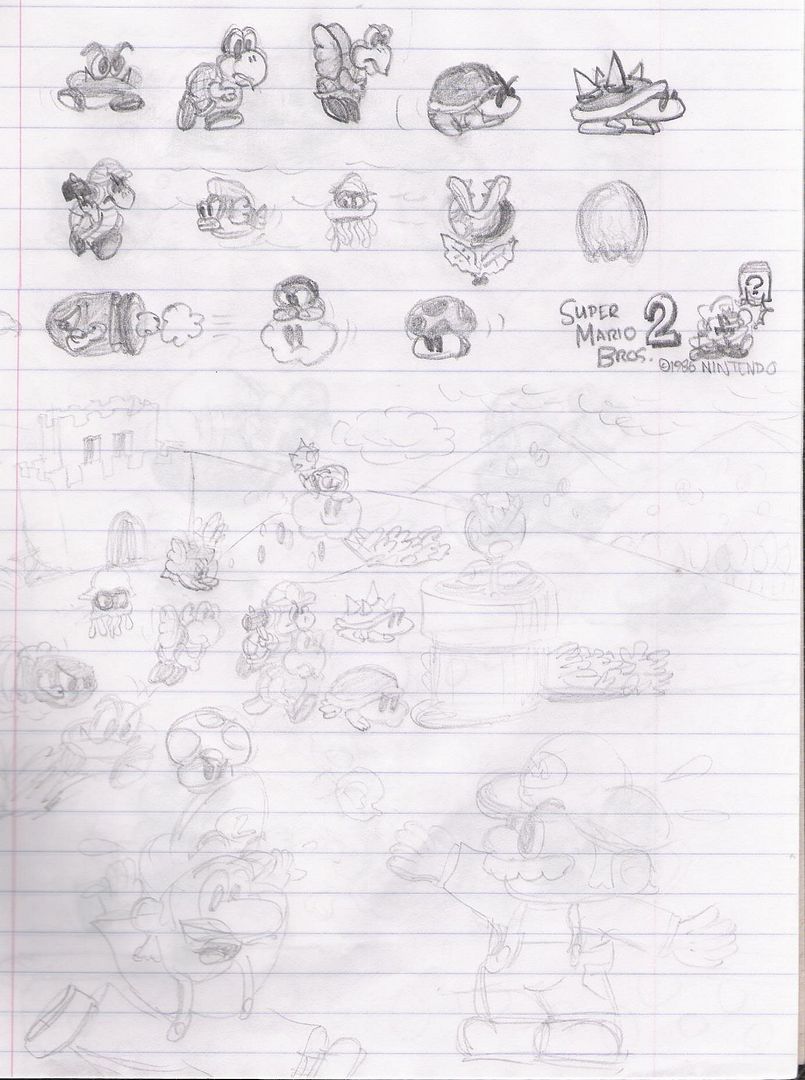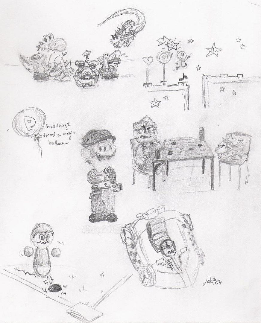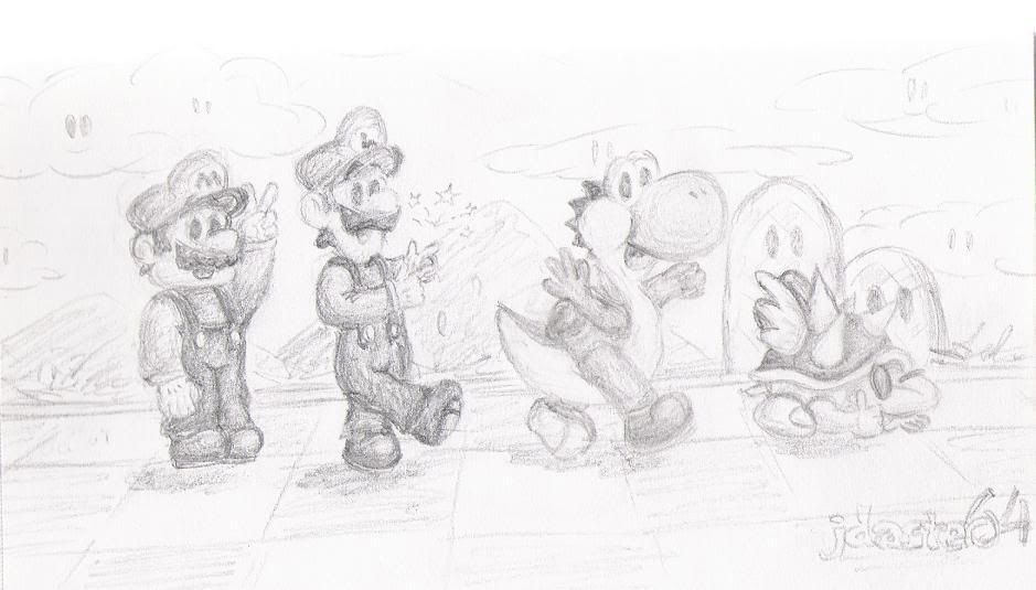Comment: Just a simple sketch of Mario, Luigi, Yoshi, and my fanchar/avatar/whatever Buzzy Beetle. This is probably my favorite sketch to date.