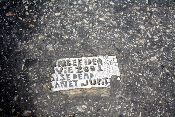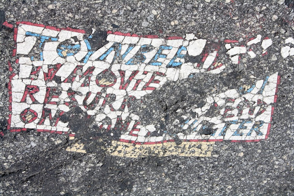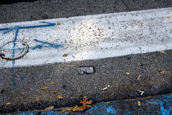 16th and Chestnut. This one, like several others, says "LAY TILES ALONE" in smaller letters on the side, which may be instruction to the reader if he or she wishes to put more tiles like this down. Apparently there used to be one in Pittsburgh that gave a description of how to make them ("linoleum, asphalt glue in several layers, then placing tar paper over it so that car wheels won't mess it up, and apparently the heat of the sun on the tar paper will bake it into the street").