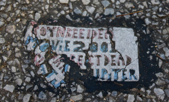 A very interesting one on Broad and Sansom. Different type of terrain than most, and it seems it either needed a different method, or reacted differently to the normal method. The word IDEA can be seen where a missing chunk of the tile would be, either a residue from the chunk or where someone wrote it back in. On the side, it says "YOU MUST LAY TILE ALONE AS HELLiON [tiles in other cities make reference to "HELiON JEWS"] AND FEDS iNFiLTRATE AND HARVEST YOU TO PRiSON"