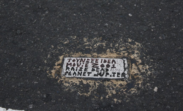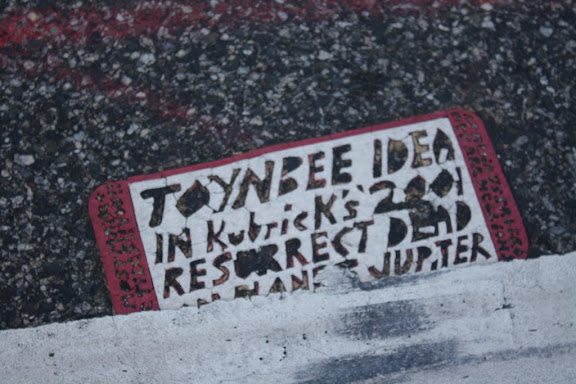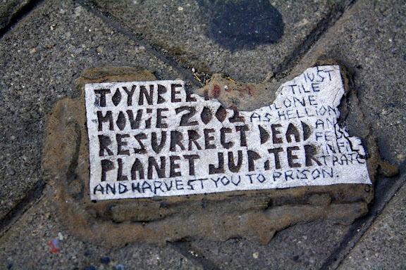 Toynbee tiles are small, enigmatic rectangles of unknown material embedded in the roads of many major cities in North and South America. Most of them say something along the lines of "TOYNBEE iDEA KubricK's `2001 RESURRECT DEAD PLANET JUPiTER". Yesterday, I went out to find as many of the ones in Philadelphia as I could, based on a list compiled in 2003. For some reason, all of them seem to be at intersections.