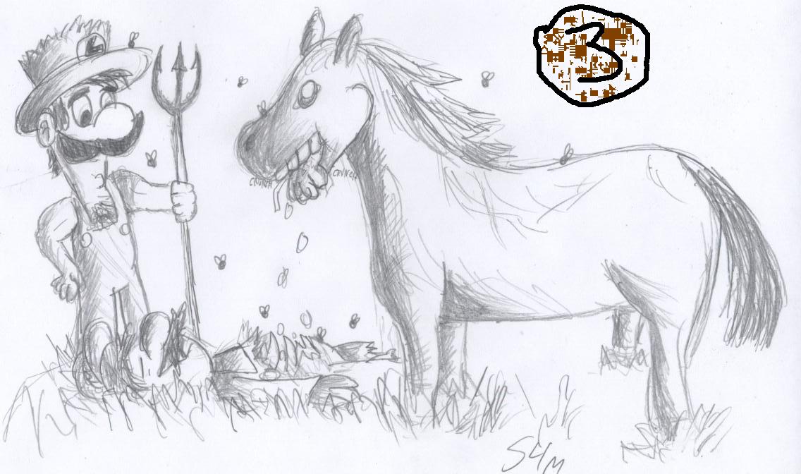 Highly considered the best drawn of all the submissions, Fifth's picture's unusual coloring makes it an eye-catcher. The thing that really got the votes though, were the laughs. Peach's concerned face. The horse's bulging mouth. Mario's helpless body struggling. This picture made everyone laugh out loud.