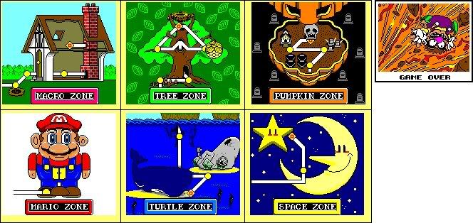It's been a while, but here's another colorization! (not that any of you were really on the edge of your seats waiting for another one...) The primary six pics are the map screens of Super Mario Land 2, with the Game Over Screen of Wario Blast thrown in. Credit goes to