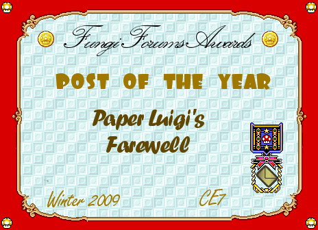 A woefully belated award goes to the now-returned PaperLuigi's farewell post.
