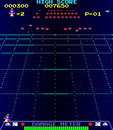 Radar Scope is a Galaxian clone. Enemies fly down from their neat little formation at the top of the screen to try to destroy the player ship. Aside from the odd angle, there are two things that set Radar Scope apart from Galaxian: the damage meter and the radar "grid." Enemies will drop decoys (with increasing frequency as the game progresses), and if the player doesn't destroy them before they hit the bottom of the screen, the damage meter goes down, causing the player to receive a lower end-of-level bonus and eventually weakening the blaster. With the "grid," if you shoot an enemy, the lower it is on the grid when it swoops down to attack, the more points the player receives for the kill. This risk-and-reward system is one of the few good things about Radar Scope. But there are so many bad things...