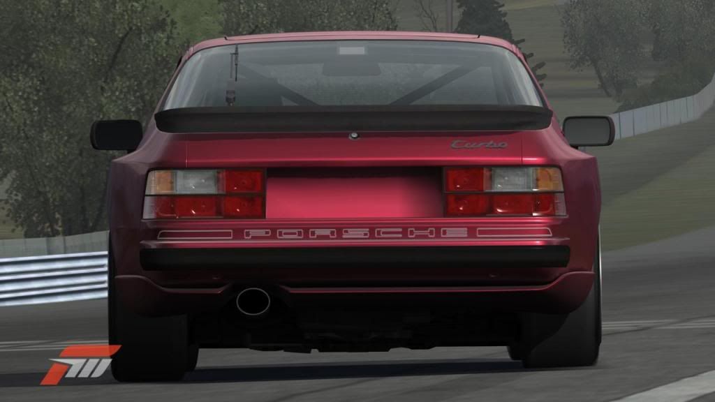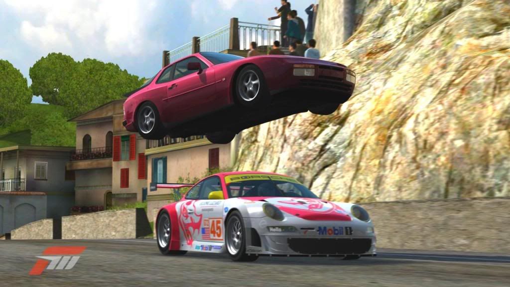 Flying away. Forza can render tire deformation, so if you look at the right rear tire, you can see it morphing (since I was turning hard).