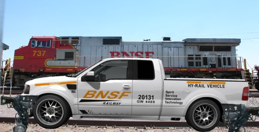 BNSF Road-Rail Vehicle aka. a "Hy-Rail" (Highway-Rail) or "Hy-Railer" Didn't take too long to create. I like how this one came out quite a bit. I crappily paint.net'd it to demonstrate what a Hy-Rail actually does and what its natural habitat would usually be.
