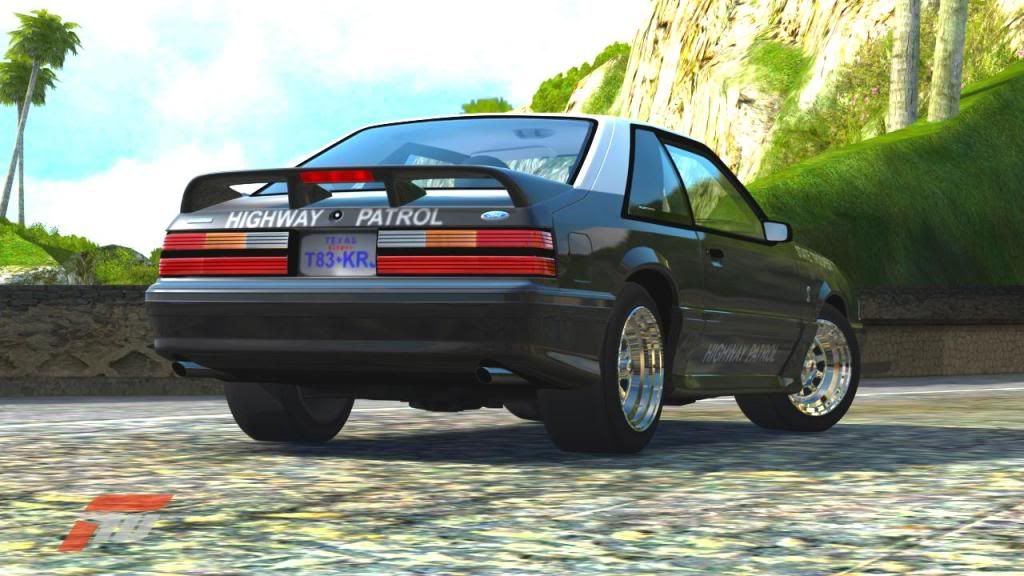 Anyway, the Mustang pictures look crappy. I was screwing with the settings and made the exposure a tiny bit too high and it makes the car's details look horrifying and the quality looks like an early 360 game. (Better ones will come soon enough.) These pictures are taken in Forza's "Photo Mode." From there you can upload the pictures to your computer. Also, all paint, lettering, "license plate," etc. on the state trooper Mustang were made in Forza's spectacular Paint section where you can make anything you want using decals, vinyls, etc. (read: lots of people have made 8-bit recreations of Mario, etc. that you can put on your car... and some people have even themed cars for Mario 3, Galaxy, etc. and much, much, much more. It's pretty awesome what people come up with). Some of these pictures don't do the game justice. On a TV screen running it at 1080p is absolutely breathtaking, and half the time you forget that the cars aren't real.