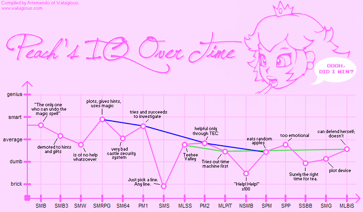 Let's add to this another variable--Peach's age. I'm going to assume she is 23 in the first game and because video games can distort things, this age remains constant over time (in other words, she is 23 in both 1985 and 2009 as well as every year in between). Folks going through this time in their lives are still developing in many ways. Mental capacity, physical strength, and brain development have yet to peak. It's also at the beginning of Erik Erikson's "Intimacy vs. Isolation" stage, and Peach may be regressing because she doesn't have a steady love partner in her life (Mario does not count since she is kidnapped and isolated from him a good bit of the time and also because I can't see them spending every waking minute of their lives together--after all Mario has to unclog toilets and fix shower heads). Failure to "pass" this stage in life may have led to a good deal of depression, which can cause mental performance to lag due to feeling down. Mental performance and capacity can also appear to be limited when trauma is part of one's life--ask a former POW about this one.