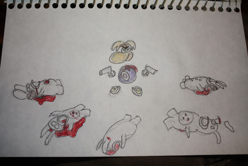 Draw Rayman celebrating the absence of the Rabbids in his new game.