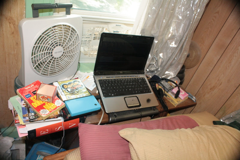 A shelf/desk thingie at the foot of my bed, though I now sleep on my bed backwards. This is where I put my laptop, as well as two fans, one of those purple lightning sphere things, two decks of cards, and whatever I decide to put on top of my most-used Bible (ESV Study Bible) -- currently, from bottom to top, some CDs, The Core DVD (perfectly good popcorn movie, and Hillary S**** is hot), a GBA SP, Chris Sawyer's Locomotion, a Gideon New Testament, Age of Empires I and II, Rhythm Heaven, my DSi, a necklace, the expanded edition of Jeff Rovin's How To Win At Nintendo Games, and the Club Nintendo hanafuda cards.