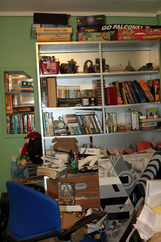 Top to bottom, left to right: A CD carrying case that I've never used, the Who Wants To Be A Millionaire home game, a couple jigsaw puzzles I've never done, the Price is Right home game, a Ripley's Believe It Or Not board game that I'm pretty sure has no instructions and only half the pieces and that I've never played, the Wheel of Fortune home game (a Tyco version where the letter frequencies are on the board; we've got an older Pressman version where you have to look that up in an included book somewhere in the attic), a woodburning kit that I only ever used to melt Lego people, a foam noodle used to cheer on my college's various sports teams at games I've never been to, a red plastic basket filled mostly with old Garfield cartoons, some of my creations from pottery classes I took at school in 01-02 and 02-03, RollerCoaster Tycoon 1, the few GBA boxes that I left intact, a pack of remote attachments for Wii Sports that I've never used, a miniature presidential podium I made for a president costume once, my DS games (My Japanese Coach, Mario Kart DS, Wario Ware Touched, Jam Sessions, Kirby Super Star Ultra, Geometry Wars Galaxies, Animal Crossing Wild World, Meteos, Yoshi's Island DS, Sonic Rush, New Super Mario Bros., Sonic Rush Adventure, Mario & Luigi: Partners in Time, and Tetris DS), a Pirates of the Caribbean puzzle, Slanty Jenga, an unnecessarily large DS starter kit, the Harry Potter books that aren't currently being borrowed by someone, an old Cheez-It box, a Left Behind RTS that I tried to play once, various other empty computer game boxes, some computer books from a class a couple semesters back, pre-WM+ jackets, more DS games (Final Fantasy IV, Chrono Trigger, The World Ends With You, Phantom Hourglass, Advance Wars: Days of Ruin, Brain Age, n+, Mario Hoops, Elite Beat Agents, Diddy Kong Racing, an empty NSMB box), some GCN and Wii games (Tales of Symphonia, Baten Kaitos, Melee, Need for Speed: Hot Pursuit 2, Starfox Adventures, Godzilla Destroy All Monsters Melee, Sonic Mega Collection, Sonic Adventure DX, Sonic Adventure 2 Battle, Final Fantasy Crystal Chronicles, Ocarina / Master Quest, Prince of Persia: Sands of Time, Blastworks, F-Zero GX, Toadstool Tour, Okami (with the green cover), Metroid Prime 2, Metroid Prime 3 (my brother's borrowing the first one), and Skies of Arcadia), a Deal or No Deal game, an old hard drive, Febreze, a stuffed Knuckles whose head needs to be sewn back on, a Wii baseball cap, some empty CD jewel cases, my second-most-used Bible, some pencils, a Wii Zapper, a giant black and white painting I did for a useless class last year, Baten Kaitos Origins, Four Swords Adventures, and some Wii games that aren't facing the camera but which are probably Wii Sports Resort, Wii Music, Mario Galaxy, and Tales of Symphonia: Dawn of the New World.