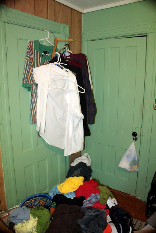 Lots of clothes, most of them clean. I've given up on being able to get into my closet, so my shirts are hung on the outside of the closet door. The plastic bag on the other door contains some Debrox.