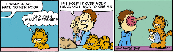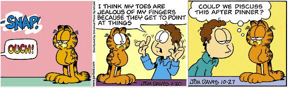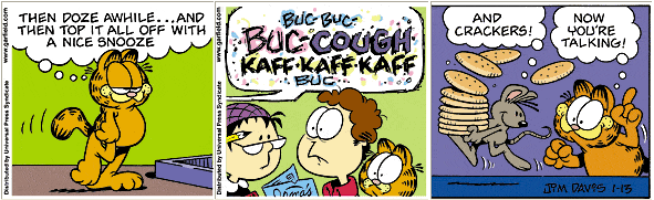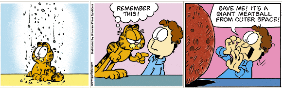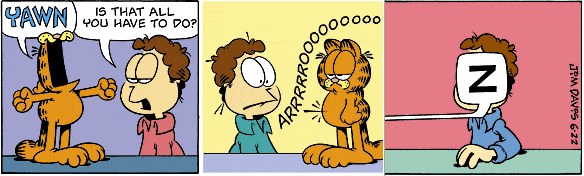 See, before I found this, I had this theory that you could take three random Garfield panels, any three, and half of the outcomes would be funnier than half of the original comics. Then I found this, got a chance to test this thoery, and found it resoundingly accurate.