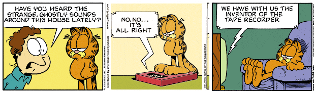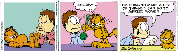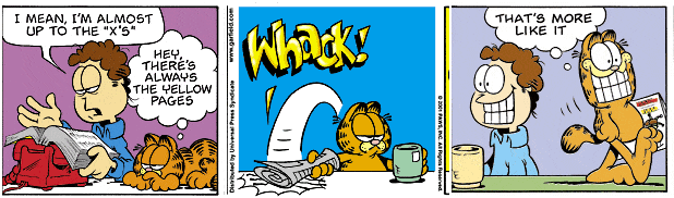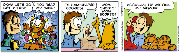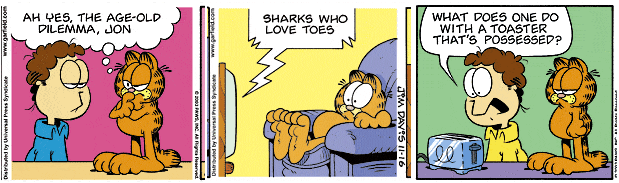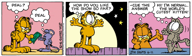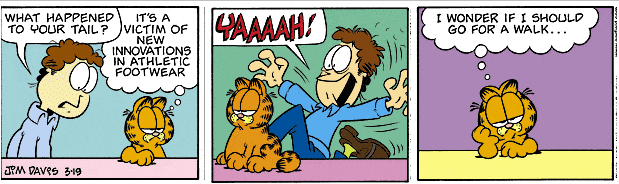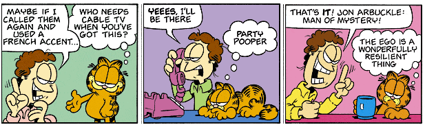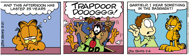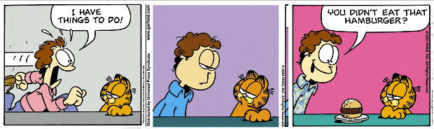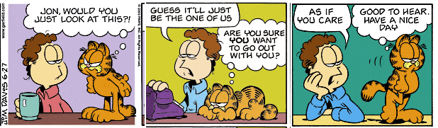 Hirocon's made me think Jon was looking at the yarn ball in the second panel, expecting to see Garfield come into his line of viosion and take the yarn ball, but after several seconds of Garfield not appearing he turned around to discover that Garfield was no longer there to take the yarn ball!